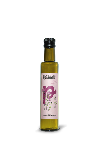 Der wilde Thymian, der Quendel, hat für diesen Ansatzessig mehrere Monate in echtem Apfel Gärungsessig gebadet.